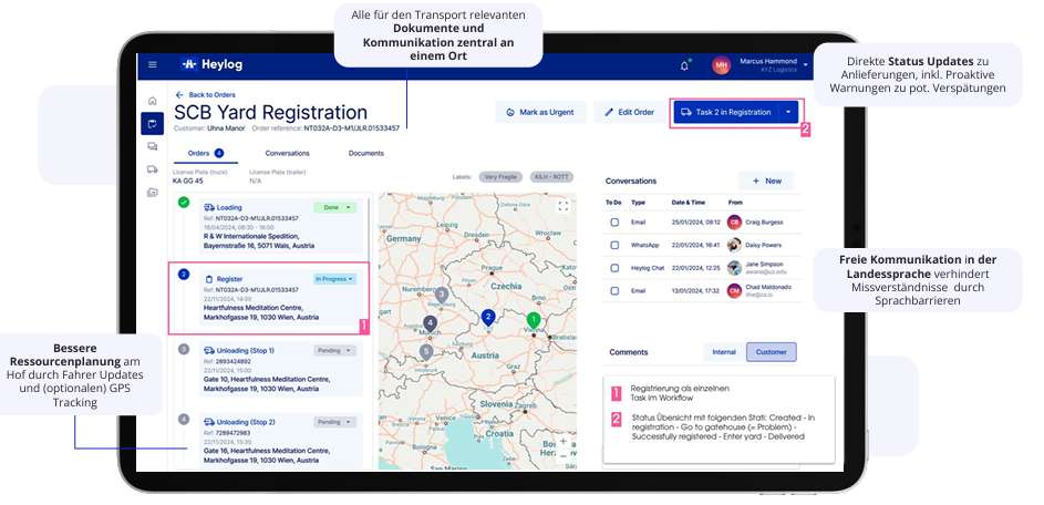 Heylog verbindet Slot-Systeme mit direkter Fahrerkommunikation. Verspätungen, Ankünfte und Rampensteuerung laufen automatisch – in Echtzeit.