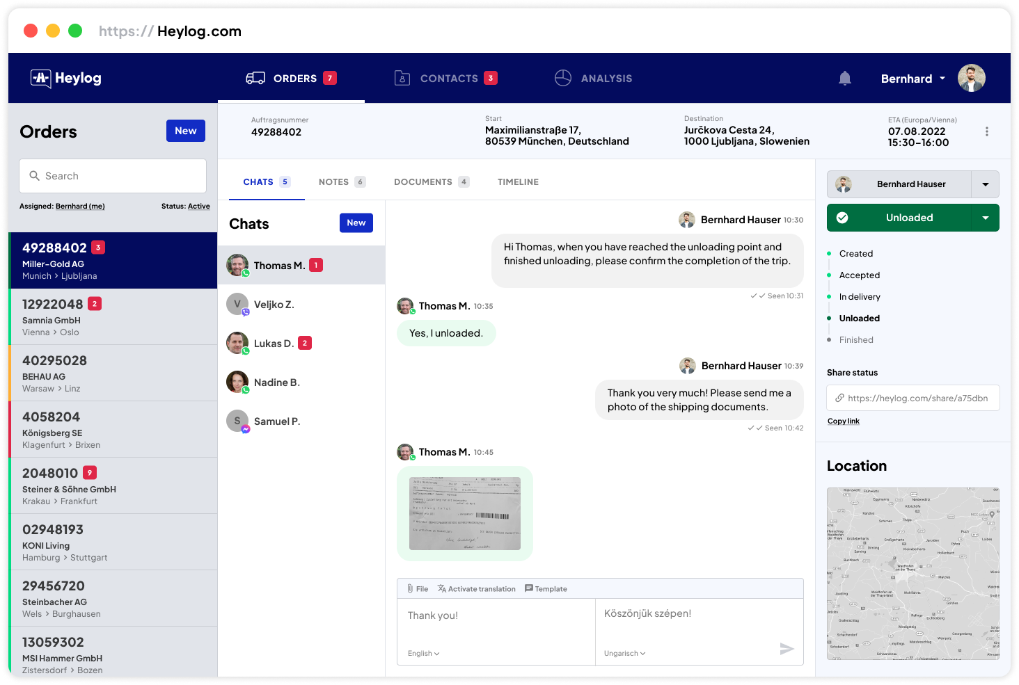 Kein Wechseln zwischen Systemen nötig – Kommunikation mit Fahrern, Disponenten und Spediteuren direkt aus einer Oberfläche.